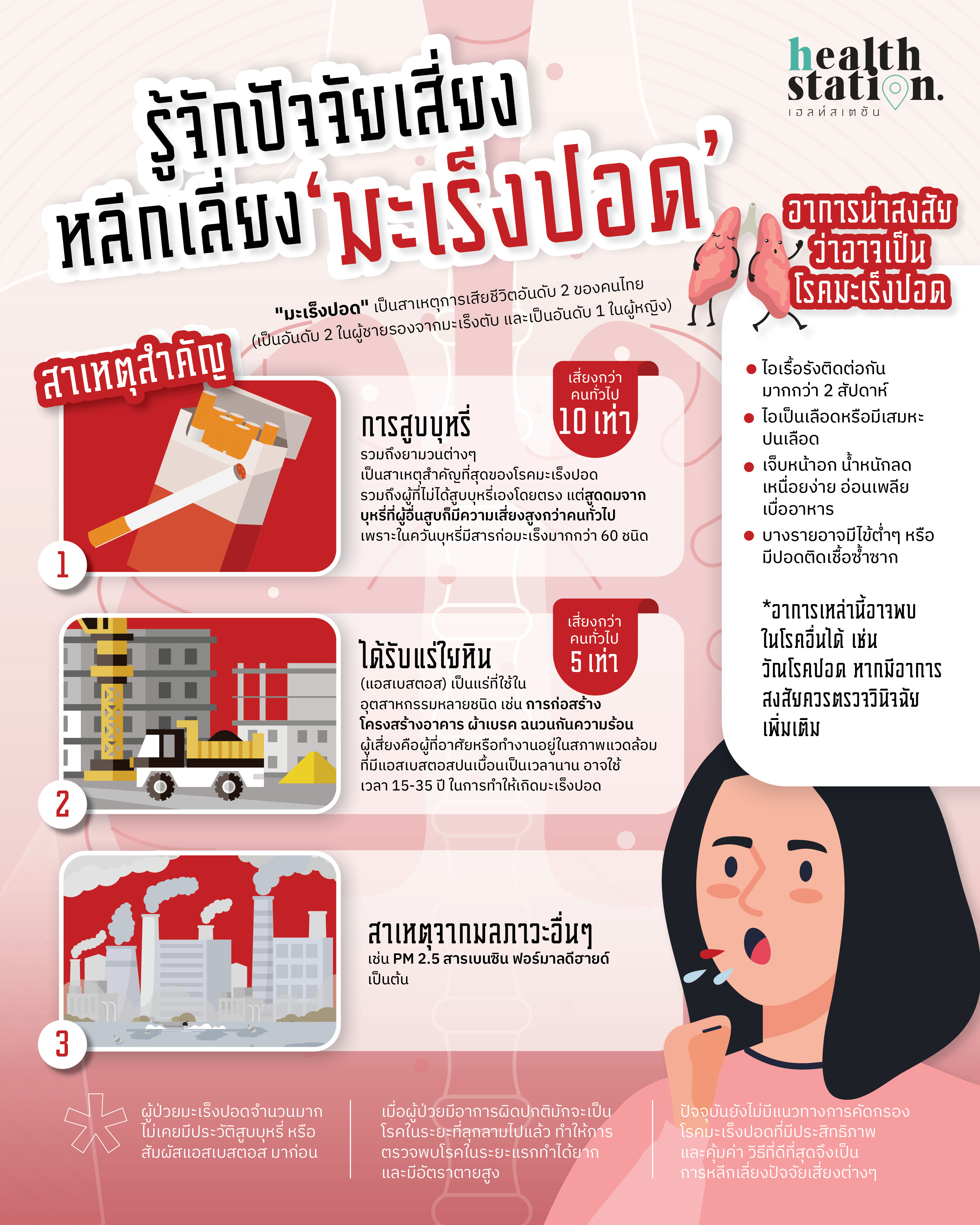 ทั้งนี้ สาเหตุสำคัญ ได้แก่ 1. การสูบบุหรี่รวมถึงยามวนต่างๆ เป็นสาเหตุสำคัญที่สุดของโรคมะเร็งปอด ผู้สูบบุหรี่อาจมีโอกาสเป็นมะเร็งปอดมากกว่าผู้ไม่สูบถึง 10 เท่า รวมถึงผู้ที่ไม่ได้สูบบุหรี่เองโดยตรง แต่สูดดมจากบุหรี่ที่ผู้อื่นสูบก็มีความเสี่ยงสูงกว่าคนทั่วไป เพราะในควันบุหรี่มีสารก่อมะเร็งมากกว่า 60 ชนิด