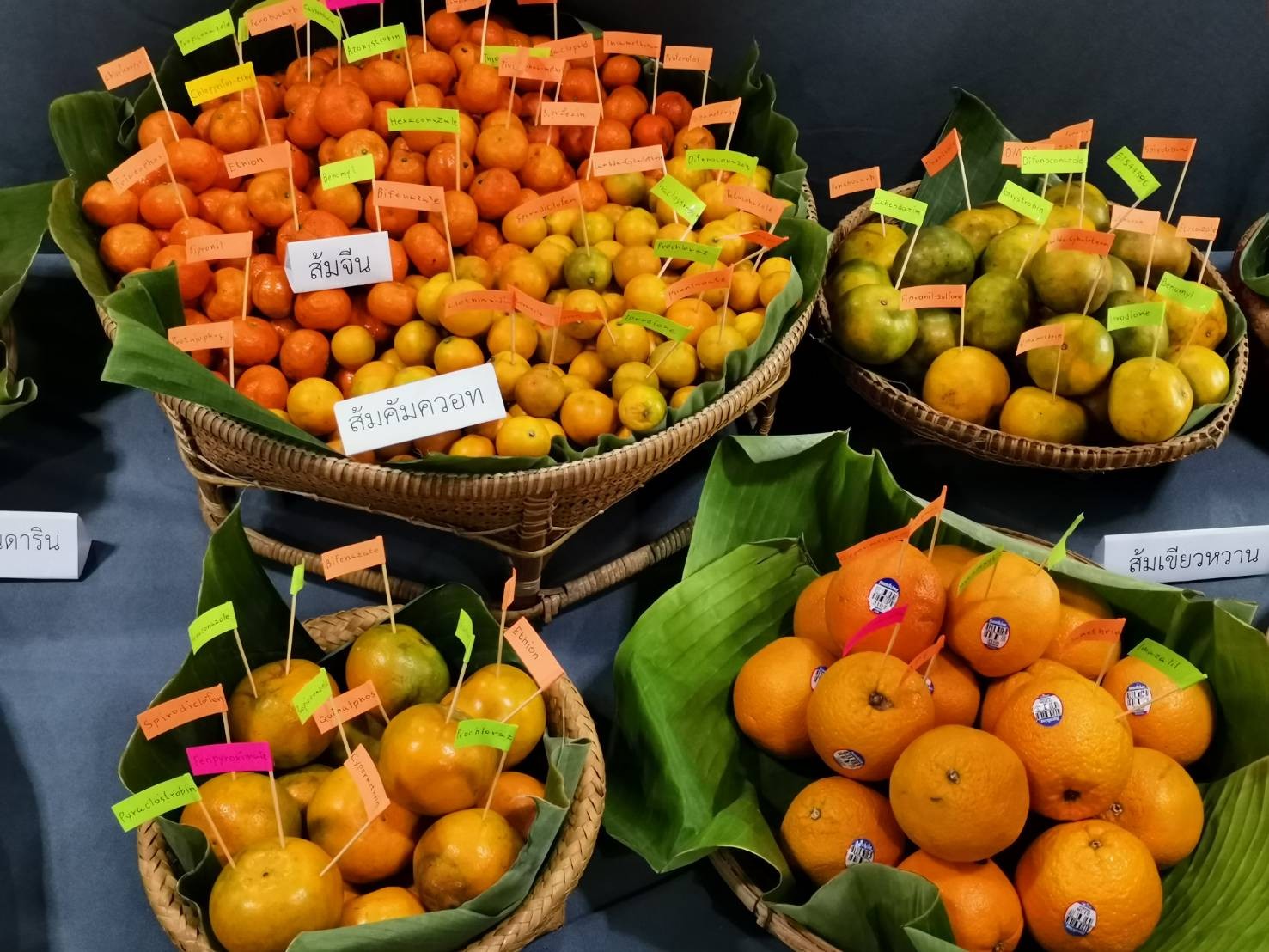 น.ส.ปรกชล อู๋ทรัพย์ ผู้ประสานงานไทยแพน กล่าวว่า ชนิดสารพิษตกค้างที่พบจากตัวอย่างส้มทั้งหมดรวม 48 ชนิด แบ่งเป็น สารกำจัดแมลง 31 ชนิด สารกำจัดโรคพืช 13 ชนิด และสารกำจัดไร 4 ชนิด โดยสารกำจัดแมลงที่พบตกค้างมากที่สุด 3 อันดับแรก คือ Imidacloprid, Ethion และ Profenofos ขณะที่สารป้องกันและกำจัดโรคพืช 3 อันดับแรกที่พบ คือ Benomyl/Carbendazim, Hexaconazole และ Prochloraz ส่วนสารกำจัดไรที่พบตกค้างมากที่สุด คือ Propargite