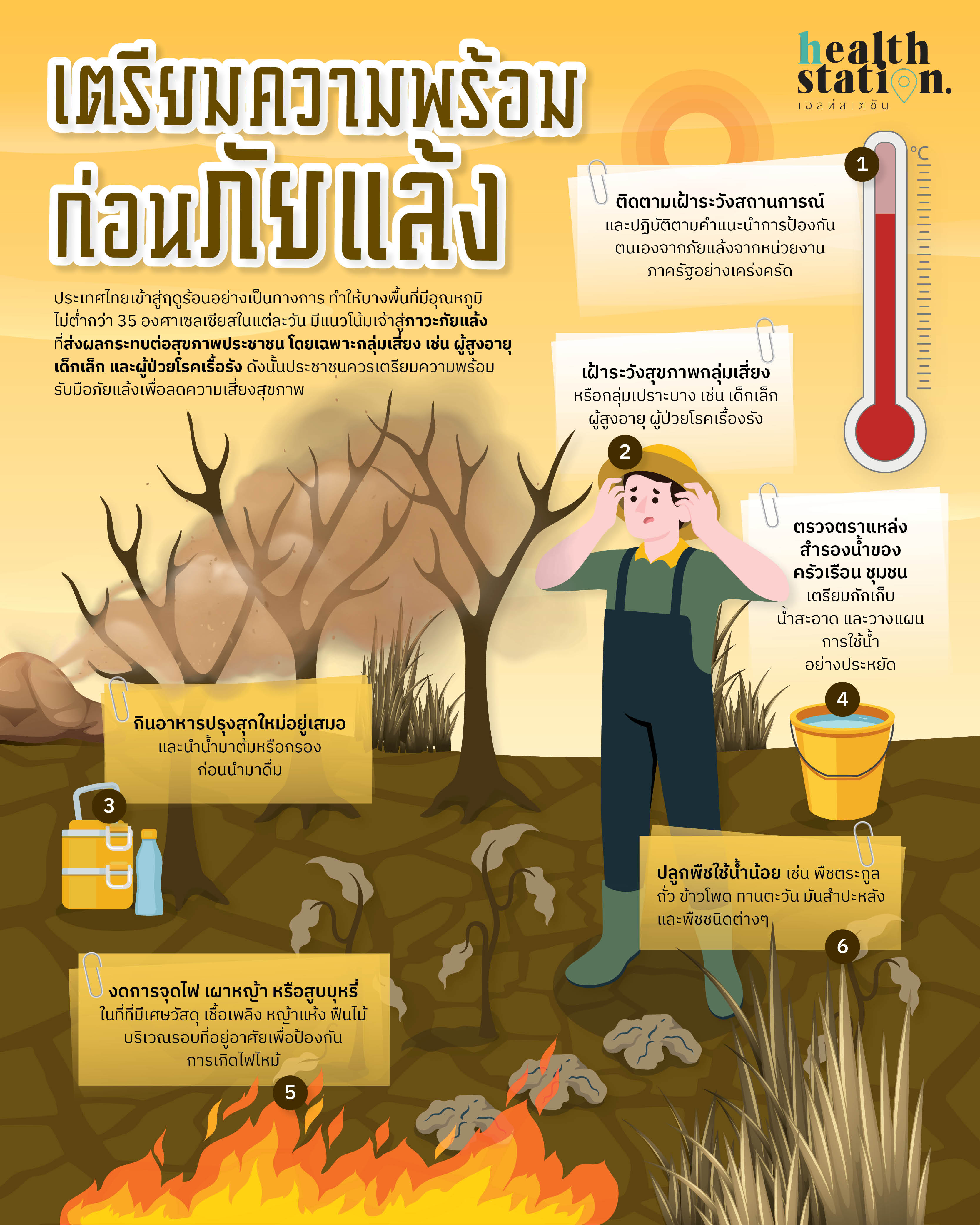 1. ติดตามเฝ้าระวังสถานการณ์ และปฏิบัติตามคำแนะนำการป้องกันตนเองจากภัยแล้งจากหน่วยงานภาครัฐอย่างเคร่งครัด