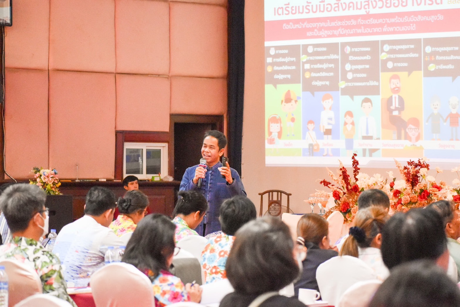 จากนั้น รศ.ดร.เจิมศักดิ์ ปิ่นทอง ประธานกรรมการนโยบายองค์การกระจายเสียงและแพร่ภาพสาธารณะแห่งประเทศไทย (ส.ส.ท.) บรรยายพิเศษ “สถานการณ์สังคมสูงวัยภัยที่ต้องเตรียมการ” ว่าสังคมสูงวัยไม่ใช่ปัญหาของผู้สูงอายุ แต่เป็นปัญหาของคนทุกช่วงวัยและกำลังส่งผลกระทบอย่างเต็มรูปแบบ สถานการณ์นี้ยังต้องการความร่วมมือในเตรียมความพร้อมหลายระดับ ซึ่งการขับเคลื่อนระบบรองรับสังคมสูงวัยประกอบด้วย 4 มิติ คือด้านเศรษฐกิจ : การออมและการส่งเสริมอาชีพ ด้านสภาพแวดล้อม : การสร้างที่อยู่อาศัยและการปรับสภาพแวดล้อมที่เหมาะสม ด้านสุขภาพ : การเตรียมรักษาสุขภาพก่อนป่วยและการดูแลในระยะยาว และด้านสังคม : การส่งเสริมการรวมกลุ่มให้เกิดการแลกเปลี่ยนช่วยเหลือเกื้อกูลกัน โดยทุกภาคส่วนต้องเข้ามามีส่วนร่วมในการวางระบบและกลไก ที่จะเตรียมความพร้อมในชุมชน