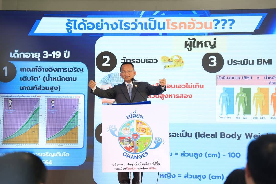 นายสมศักดิ์ เทพสุทิน กล่าว ให้ความสำคัญกับเด็กอ้วนในปัจจุบันพบเด็กเล็กอายุ 1-5 ปี มีภาวะน้ำหนักเกินเด็กวัยเรียนอ้วนร้อยละ 15.4 ถือเป็นอันดับ 3 ในกลุ่มอาเซียน ในขณะที่คนไทยอายุ 15 ปีขึ้นไปเป็นโรคอ้วนสูงถึงร้อยละ 42.4 โรคอ้วนเป็นบ่อเกิดปัญหาสุขภาพ NCDs ในอนาคตด้วยเช่นกัน