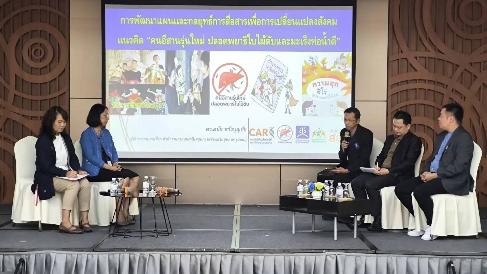 ภายในงานมีการเสวนาโดยผู้ทรงคุณวุฒิ ได้แก่ นพ.ปรีดา แต้อารักษ์ จาก สช. กล่าวถึงความท้าทายในการสื่อสารเปลี่ยนค่านิยมการกินอาหารของคนอีสาน และย้ำว่าการป้องกันคือทางออกที่ดีที่สุด เนื่องจากโรคมะเร็งท่อน้ำดีรักษาได้ยาก ขณะที่ รศ.ดร.วัชรินทร์ ลอยลม ผู้อำนวยการสถาบันวิจัยมะเร็งท่อน้ำดี มข. เผยว่าปัจจุบันมีผู้ป่วยโรคนี้ราว 20,000 รายทั่วประเทศ โดยครึ่งหนึ่งอยู่ในภาคอีสาน ซึ่งจังหวัดอุดรธานีและขอนแก่นพบมากที่สุด