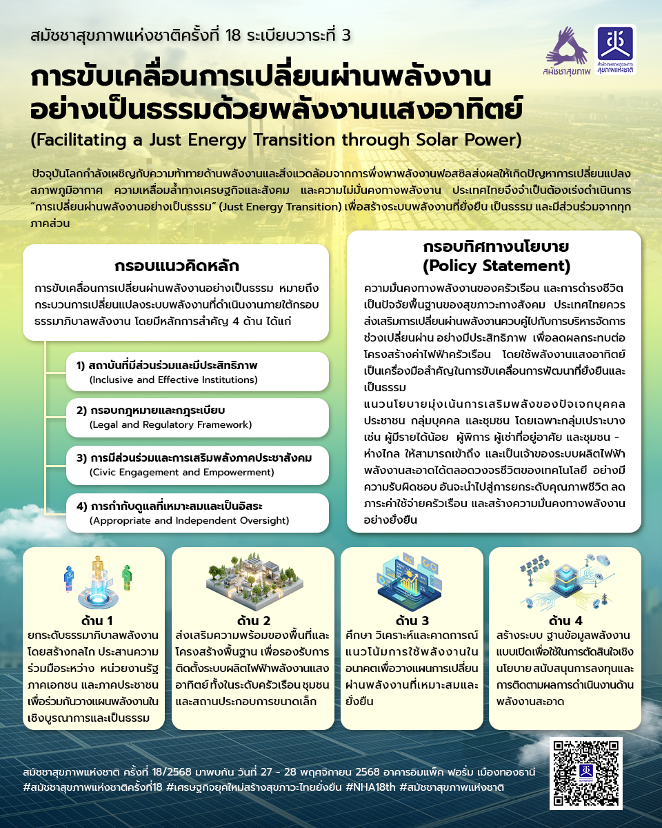 เหลืออีกไม่กี่อึดใจแล้วสำหรับงานสมัชชาสุขภาพแห่งชาติ ครั้งที่ 18 ภายใต้ธีม “เศรษฐกิจยุคใหม่สร้างสุขภาวะไทยยั่งยืน” ซึ่งใน Healthstation Talk EP.40 นี้ เราจะชวนทุกคนไปทำความรู้จักอีกหนึ่งประเด็นสำคัญที่ถูกหยิบยกขึ้นมาเป็นระเบียบวาระครั้งนี้ นั่นคือ “การเปลี่ยนผ่านพลังงานอย่างเป็นธรรมด้วยพลังงานแสงอาทิตย์ (Facilitating a Just Energy Transition through Solar Power)”