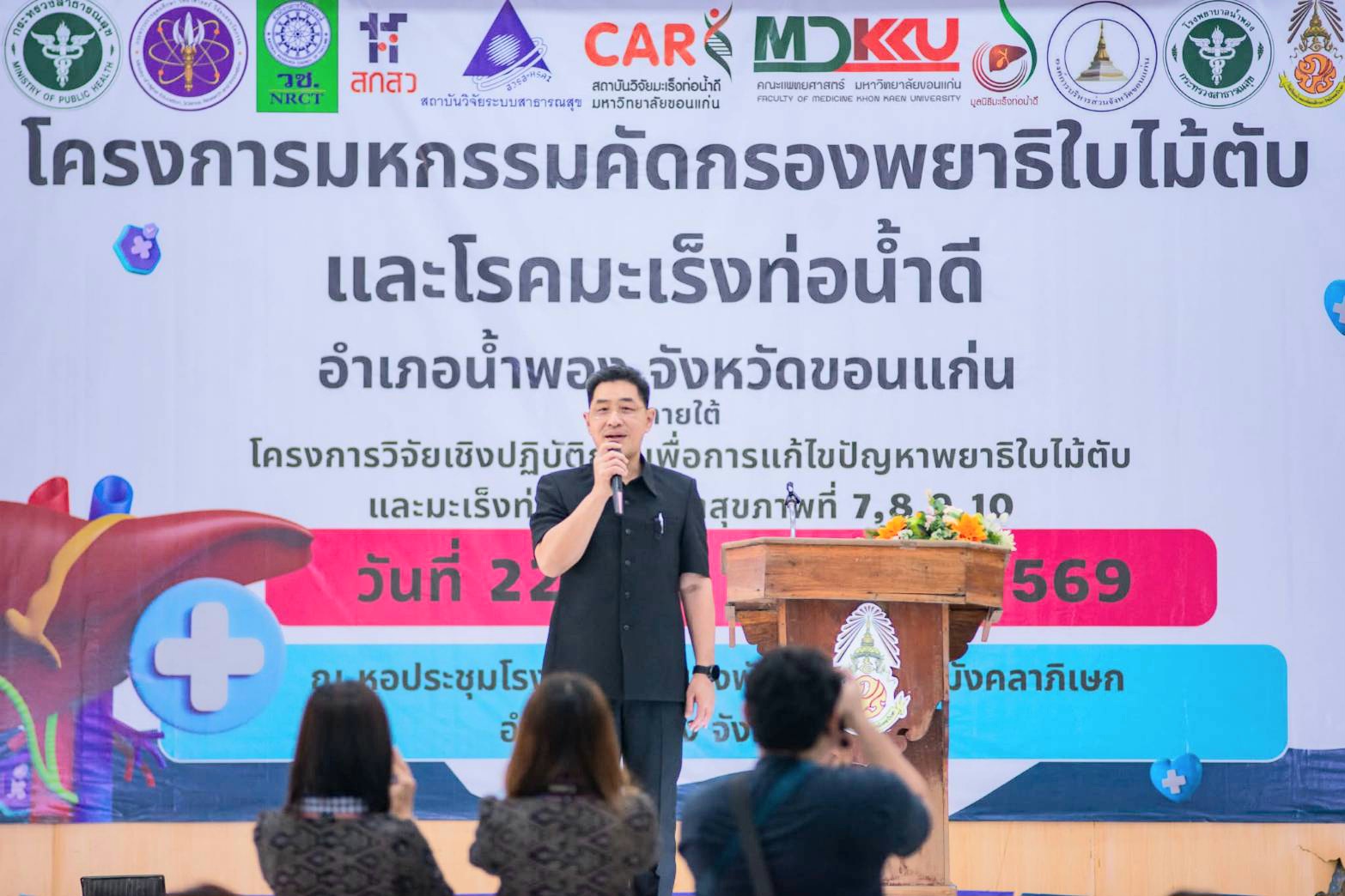 เมื่อวันที่ 27 มกราคม 2569 ผู้สื่อข่าวประจำ จังหวัดขอนแก่น รายงานว่า ที่ หอประชุมโรงเรียนน้ำพองพัฒนศึกษารัชมังคลาภิเษก อำเภอน้ำพอง จังหวัดขอนแก่น สถาบันวิจัยมะเร็งท่อน้ำดี มหาวิทยาลัยขอนแก่น ร่วมกับ มูลนิธิมะเร็งท่อน้ำดี องค์การบริหารส่วนจังหวัดขอนแก่น สำนักงานสาธารณสุขจังหวัดขอนแก่น อำเภอน้ำพอง และโรงพยาบาลน้ำพอง จัดกิจกรรม “มหกรรมตรวจคัดกรองพยาธิใบไม้ตับและโรคมะเร็งท่อน้ำดี” โดยได้รับเกียรติจาก นายแพทย์อภิชัย ลิมานนท์ นายแพทย์สาธารณสุขจังหวัดขอนแก่น เป็นประธานในพิธีเปิดกิจกรรม พร้อมด้วย นายนาวิน คำเวียง รองนายกองค์การบริหารส่วนจังหวัดขอนแก่น กล่าวถึงบทบาทขององค์การบริหารส่วนจังหวัดขอนแก่นในการสนับสนุนการดำเนินงานด้านสาธารณสุขเชิงรุก และการบูรณาการความร่วมมือกับทุกภาคส่วนเพื่อดูแลสุขภาพประชาชนในพื้นที่