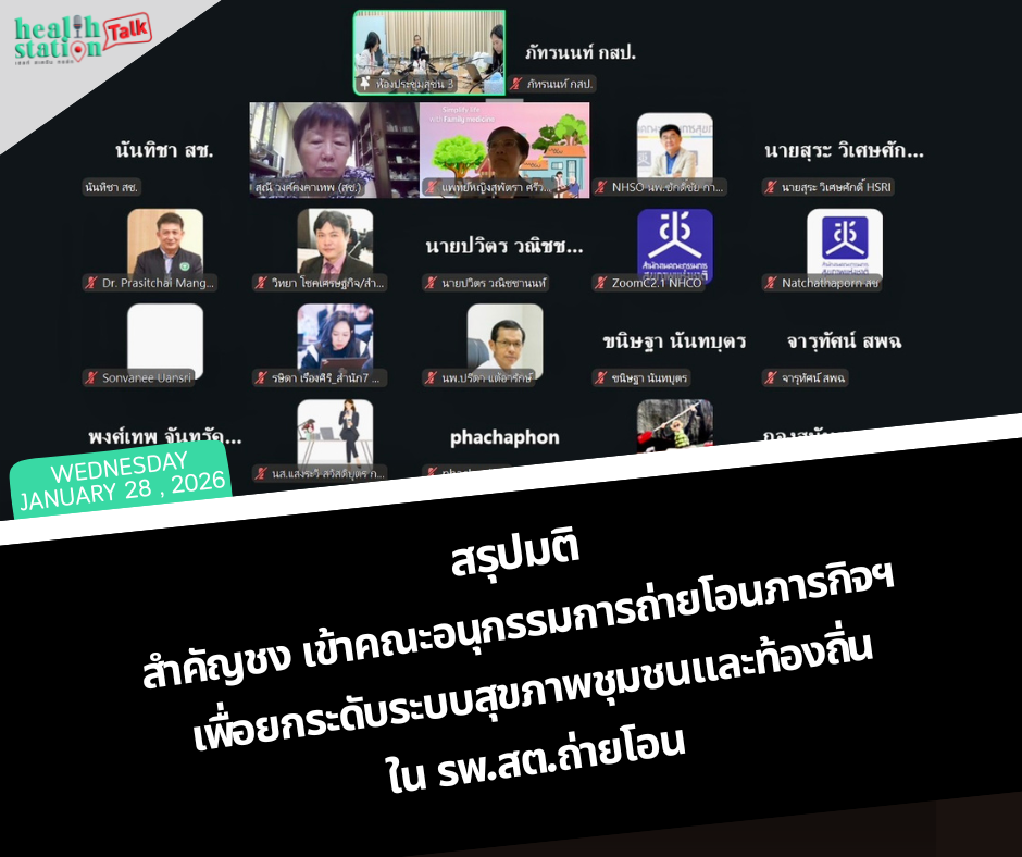 วันที่ 28 ม.ค. 69 คณะทำงานพิจารณาศึกษาแนวทางการพัฒนาและสนับสนุนระบบสุขภาพปฐมภูมิขององค์การบริหารส่วนจังหวัดในช่วงเปลี่ยนผ่าน จัดการประชุมครั้งที่ 8/2569 ซึ่งเป็นโครงการที่ได้รับทุนสนับสนุนจากสำนักสนับสนุนการพัฒนาระบบสุขภาพ (สำนัก 7) สำนักงานกองทุนสนับสนุนการสร้างเสริมสุขภาพ (สสส.) เพื่อติดตามความคืบหน้าการถ่ายโอนภารกิจและยกระดับมาตรฐานบริการสุขภาพท้องถิ่น ณ ห้องประชุมสุชน 3 ชั้น 3 อาคารสุขภาพแห่งชาติ (สช.) และผ่านระบบออนไลน์ Zoom Conference เวลา 13.30 – 16.30 น.