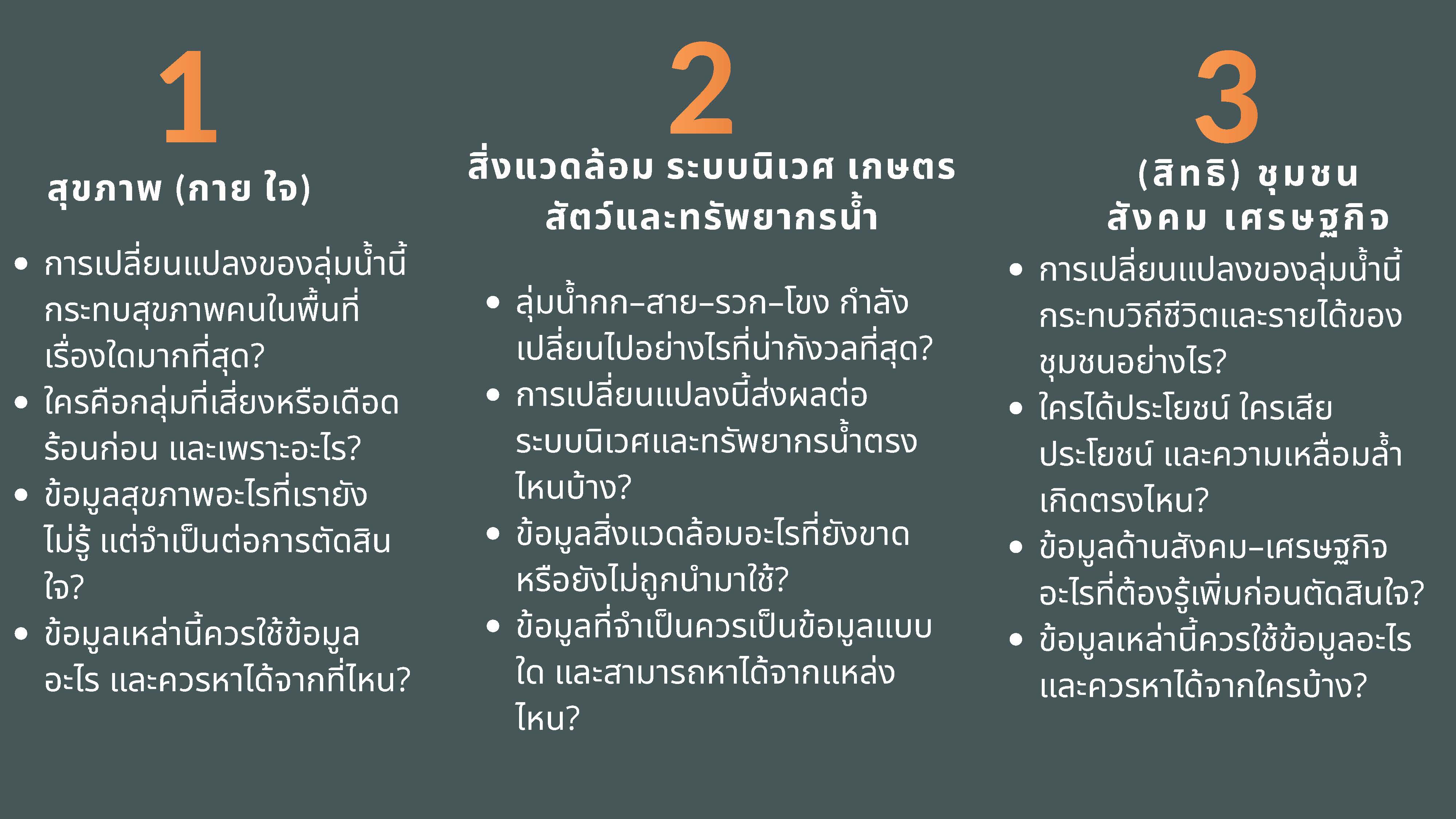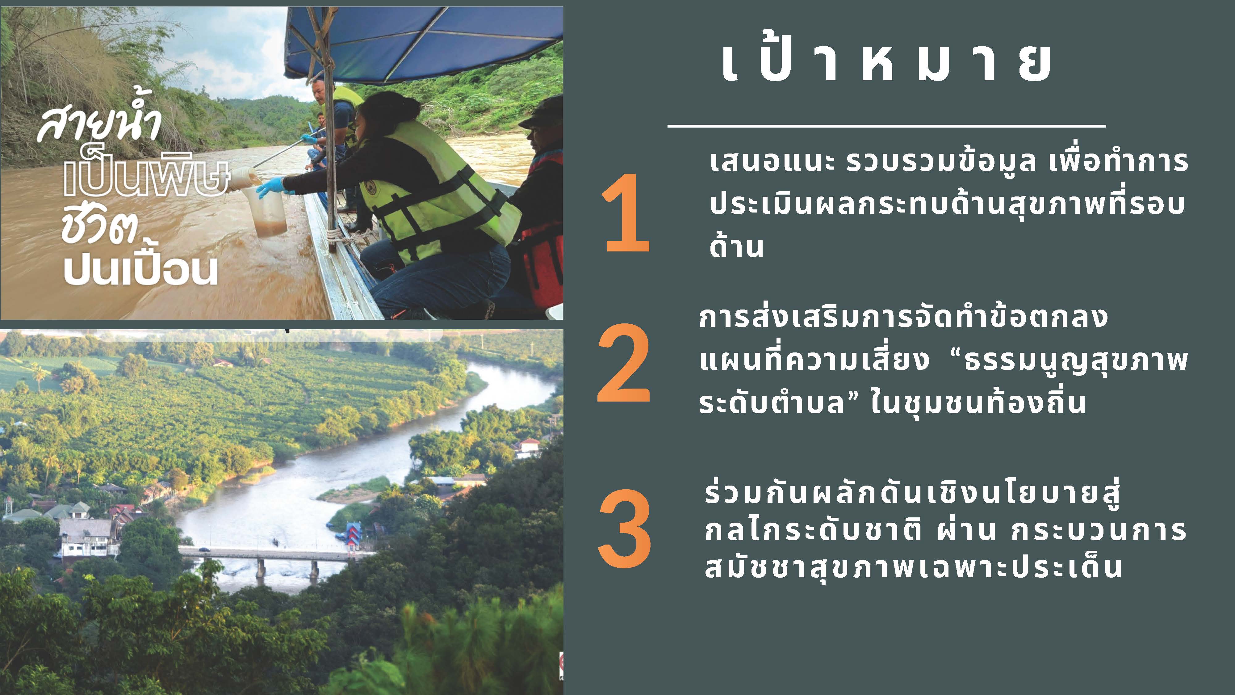 - พัฒนากลไกความร่วมมือในการขับเคลื่อนนโยบายสาธารณะระดับลุ่มน้ำ พร้อมผลักดันข้อเสนอเชิงนโยบายผ่านกระบวนการสมัชชาสุขภาพเฉพาะประเด็น