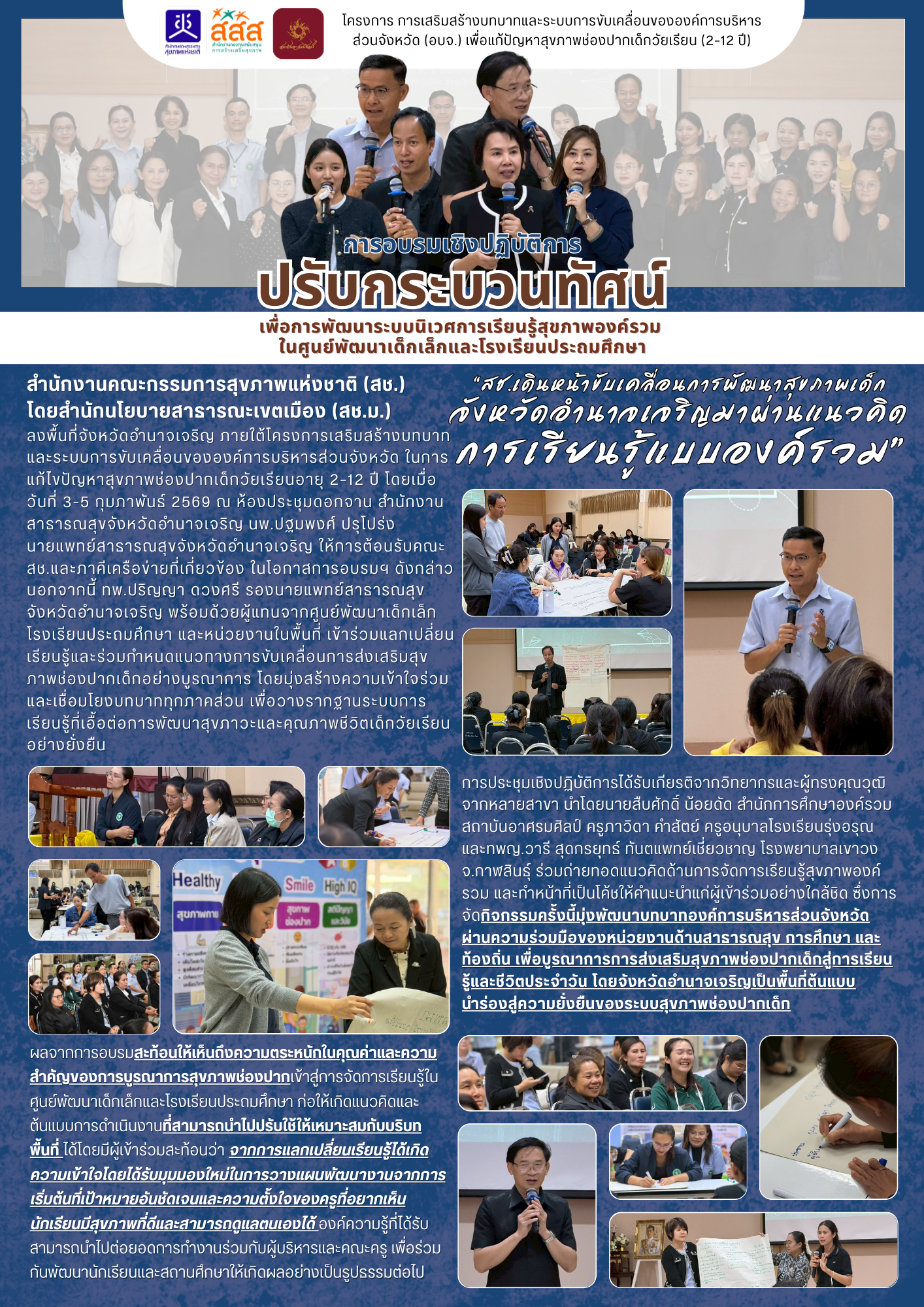สำนักงานคณะกรรมการสุขภาพแห่งชาติ (สช.) โดยสำนักนโยบายสาธารณะเขตเมือง (สช.ม.) ลงพื้นที่จังหวัดอำนาจเจริญ ระหว่างวันที่ 3–5 กุมภาพันธ์ 2569 ณ ห้องประชุมดอกจาน สำนักงานสาธารณสุขจังหวัดอำนาจเจริญ เพื่อเสริมพลังบทบาท องค์การบริหารส่วนจังหวัด (อบจ.) ในการแก้ไขปัญหาสุขภาพช่องปากเด็กวัยเรียนอายุ 2–12 ปี