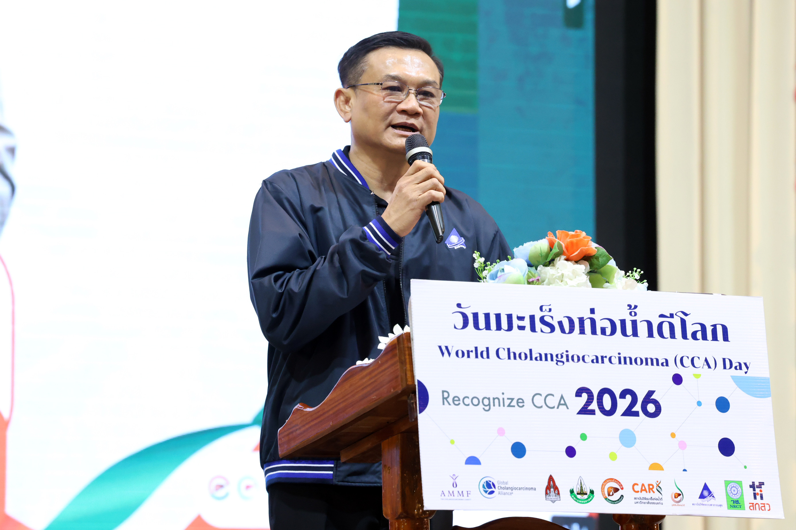 รศ.ดร.วัชรินทร์ ลอยลม รักษาการแทนผู้อำนวยการสถาบันวิจัยมะเร็งท่อน้ำดี กล่าวว่า วันนี้ถือว่าเป็นวันใหญ่ของ World CCA ซึ่งปีนี้เราเลือกมาทำกิจกรรมที่ จ.หนองคาย เพื่อเป็นจังหวัดต้นแบบของการแก้ปัญหาพยาธิใบไม้ตับและมะเร็งท่อน้ำดี แบบครบวงจรโดยอาศัยหลักการสุขภาพหนึ่งเดียว ได้แก่ การตัดวงจรชีวิตของพยาธิใบไม้ตับ (ลดการติดเชื้อพยาธิใบไม้ตับในคน) สร้างการรับรู้และตระหนักรู้เกี่ยวกับพยาธิใบไม้ตับและมะเร็งท่อน้ำดี การผลิตอาหารปลอดพยาธิใบไม้ตับ จัดระบบสุขาภิบาลสิ่งแวดล้อม การค้นหาและนำประชากรกลุ่มเสี่ยงโรคพยาธิใบไม้ตับและมะเร็งท่อน้ำดีเข้าสู่ระบบการคัดกรอง การวินิจฉัย และการดูแลรักษา
