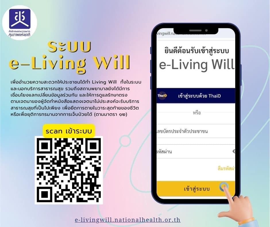 ทางด้านคุณปรางทิพย์ ได้ฝากเพิ่มเติมว่า สำหรับบูธ e-Living Will ของ สช. ในงานครั้งนี้ จะอยู่ในนิทรรศการสมุดเบาใจ ซึ่งพวกเราได้พัฒนาให้ประชาชนสามารถทำระบบ e-Living Will ในระบบออนไลน์ได้ด้วยตัวเอง อีกทั้งให้สถานบริการทางการแพทย์ต่างๆ ขึ้นทะเบียนระบบดั่งกล่าวนี้ไว้ เพื่อสามารถเห็นทะเบียนของผู้ที่ทำ e-Living Will ไว้ ฉะนั้นระบบนี้จะเอื้อให้ประชาชนทำหนังสือแสดงเจตนาของตัวเองได้ตลอดเวลาและสามารถแก้ไขข้อมูลได้