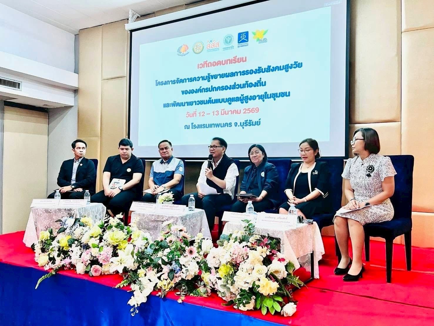 เมื่อวันที่ 12–13 มีนาคม 2569 ณ โรงแรมอัลวาเลซ จังหวัดบุรีรัมย์ มีการจัดเวทีถอดบทเรียนการดำเนินงานภายใต้โครงการ “จัดการความรู้และขยายผลการรองรับสังคมสูงวัยขององค์กรปกครองส่วนท้องถิ่น และการพัฒนาเยาวชนต้นแบบดูแลผู้สูงอายุในชุมชน (Young Care)” จัดโดยสำนักประสานนโยบายรองรับสังคมสูงวัย (สป.สว.) ร่วมกับมูลนิธิสานพลังเพื่อแผ่นดิน และกรมส่งเสริมการปกครองท้องถิ่น (สถ.) โดยได้รับการสนับสนุนจากสำนักงานกองทุนสนับสนุนการสร้างเสริมสุขภาพ (สสส.)