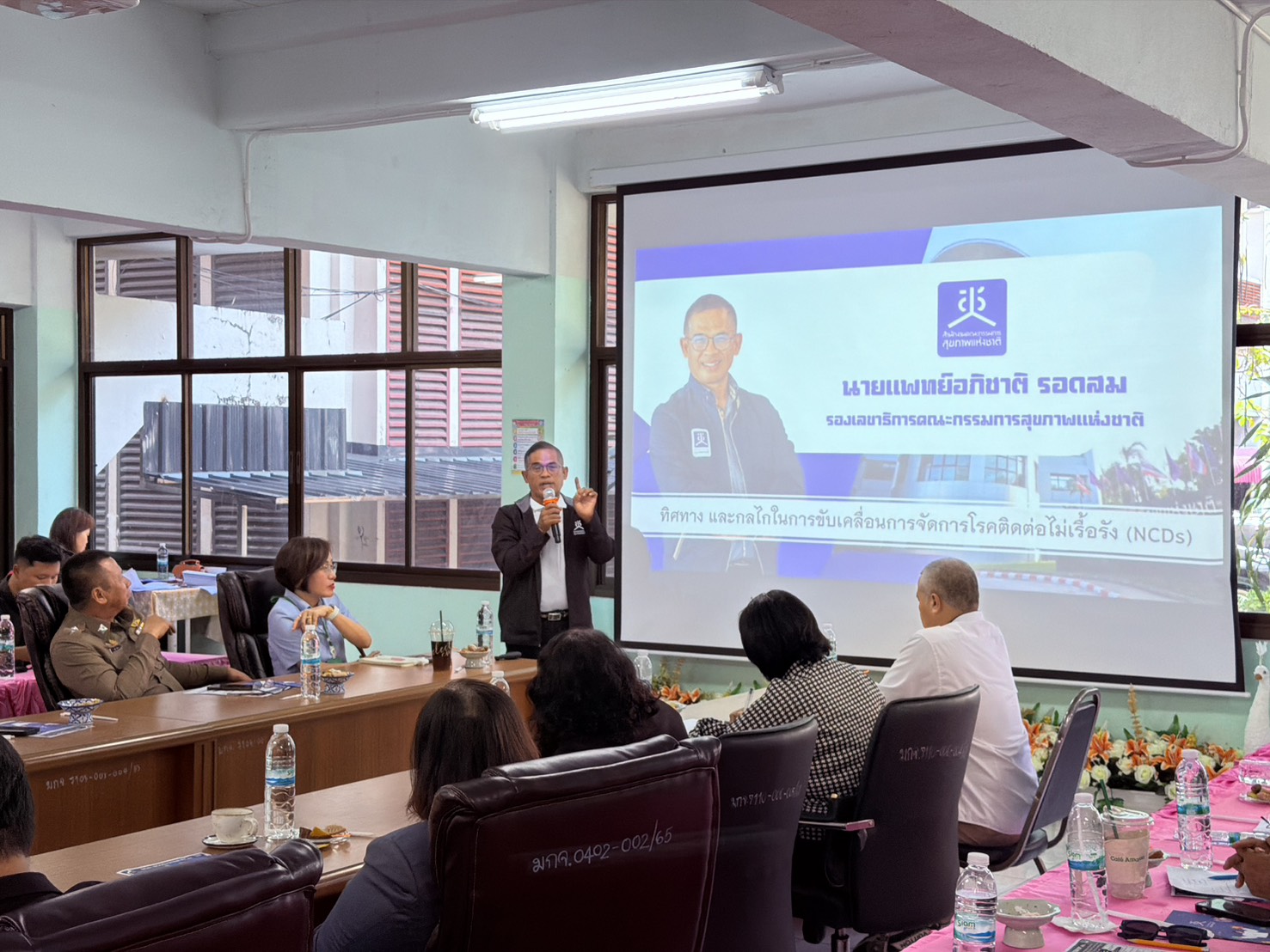 นพ.อภิชาติ รอดสม รองเลขาธิการคณะกรรมการสุขภาพแห่งชาติ เป็นประธานกล่าวเปิดประชุม และเสนอแนวทาง ทิศทาง และกลไกในการขับเคลื่อนการจัดการโรคติดต่อไม่เรื้อรัง (NCDs) โดยมุ่งเน้นการสร้าง “สภาวะแวดล้อมที่เอื้อต่อพฤติกรรมสุขภาพ” เพื่อลดโรคไม่ติดต่อเรื้อรัง (NCDs) อย่างยั่งยืนภายในปี 2570 โดยใช้ “โมเดลน่าน 3:5:5” (3 หลักการสำคัญ, 5 ระบบกลไกหนุนเสริม, 5 มาตรการหลัก) ผ่านการบูรณาการความร่วมมือจากทุกภาคส่วน