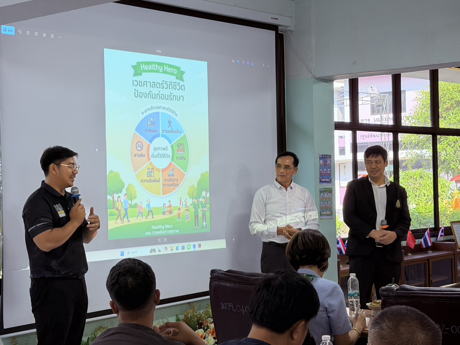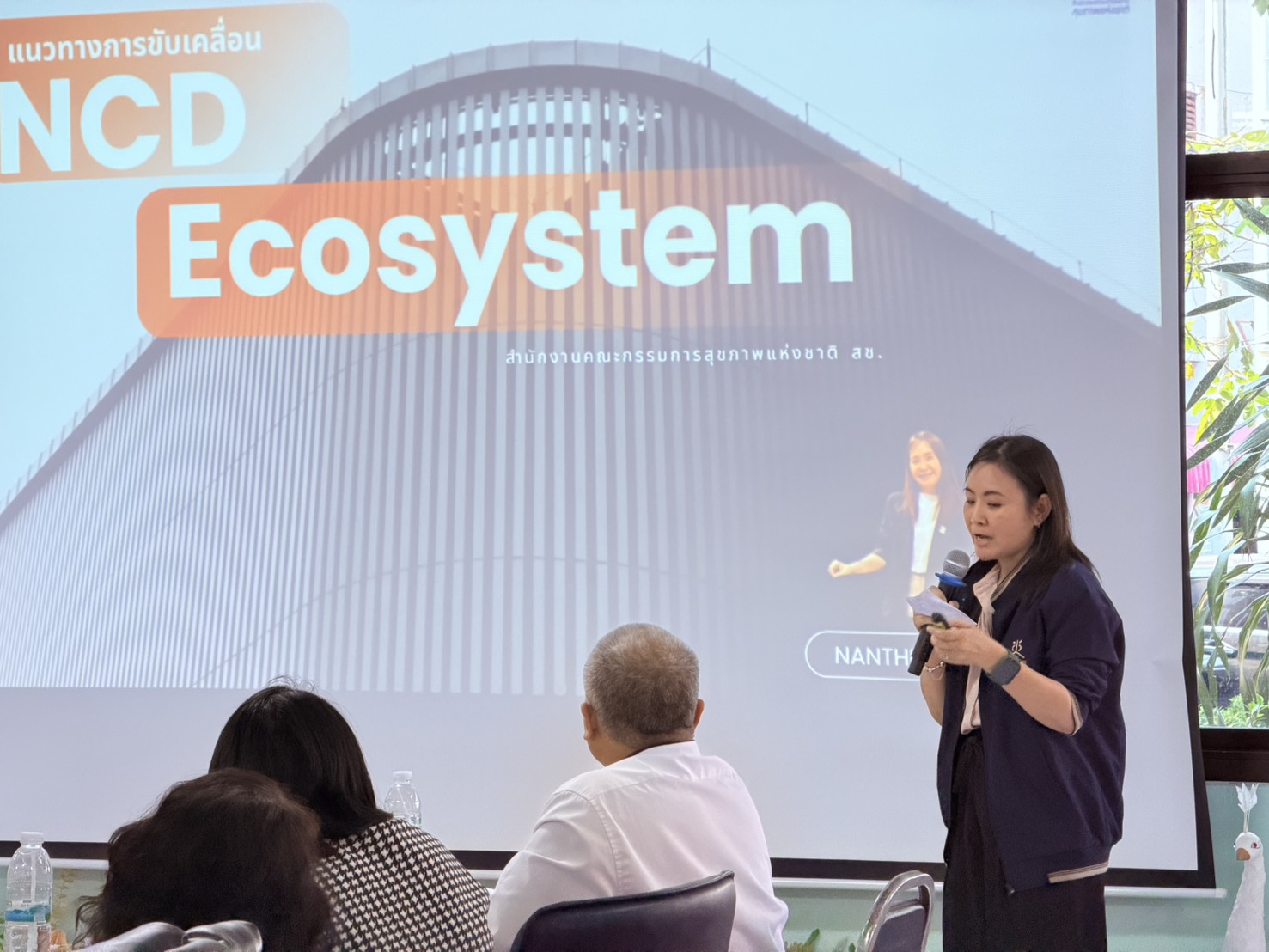 คุณนันทิยา ลิ่วลักษณ์ สช. ได้นำเสนอกรอบทิศทางนโยบายมาตรการ 3:5:5 Ecosystem ที่ใช้ลดโรคไม่ติดต่อเรื้องรัง (NCDs) ซึ่งมุ่งเน้นการปรับสภาพแวดล้อมใน 3 พื้นที่ยุทธศาสตร์ ได้แก่ สถานศึกษา ชุมชน และสถานประกอบการ/พื้นที่เชิงพาณิชย์ ควบคู่กับการใช้มาตรการเชิงนวัตกรรมเพื่อจูงใจให้เกิดการปรับเปลี่ยนพฤติกรรม เช่น การลดหวานในอาหาร การสร้างแรงจูงใจผ่านระบบแต้มสุขภาพ และการใช้แนวคิด “21 วันเปลี่ยนพฤติกรรม”