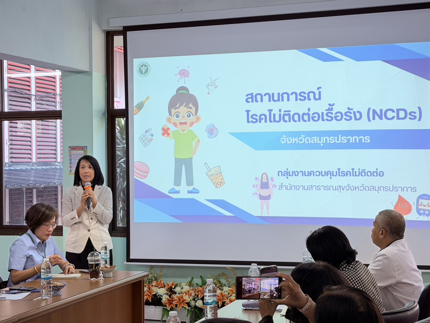 คุณวสุนธรา พระรักษา ผู้แทนสำนักงานสาธารณสุขจังหวัดสมุทรปราการ ได้นำเสนอสถานการณ์ ความสำคัญการขับเคลื่อนกลไกการป้องกันและจัดการของโรคติดต่อไม่เรื้อรัง (NCDs) ในพื้นที่จังหวัด สมุทรปราการ พบว่าแนวโน้มการเกิดโรคยังคงเพิ่มสูงขึ้นอย่างต่อเนื่อง โดยมีปัจจัยเสี่ยงหลักจากพฤติกรรมสุขภาพ เช่น การบริโภคอาหารไม่เหมาะสม การขาดกิจกรรมทางกาย และความเครียด ส่งผลให้เกิดภาระค่าใช้จ่ายด้านสุขภาพและการสูญเสียทางเศรษฐกิจในระดับสูง