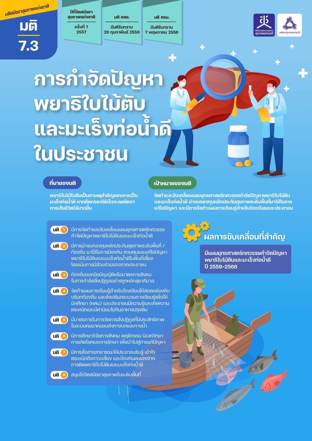 นพ.สุเทพ เพชรมาก เลขาธิการคณะกรรมการสุขภาพแห่งชาติ กล่าวว่า สมัชชาสุขภาพแห่งชาติ ได้มีมติ ขับเคลื่อนการกำจัดปัญหาพยาธิใบไม้ตับและมะเร็งท่อน้ำดี ในประชาชนอย่างต่อเนื่อง โดยตั้งเป้าหมายผู้ติดเชื้อเป็นศูนย์ เน้นการสร้าง “นักสื่อสารเพื่อการเปลี่ยนแปลง” และผลงานนวัตกรรมที่: กระตุ้นการปรับเปลี่ยนพฤติกรรม: ทำให้การกินแบบปรุงสุก กลายเป็นวิถีใหม่ สร้างความตื่นตัวในเด็กและเยาวชน ผ่านมาตรการเชิงรุก ทั้งเรื่องการรณรงค์ให้กลุ่มเสี่ยงเข้าตรวจด้วยชุดตรวจ OV-ATK การสร้างฐานข้อมูลกลุ่มเสี่ยง รวมถึงสร้างการมีส่วนร่วมทางดิจิทัล: ผ่านแคมเปญที่สนุก เข้าถึงง่าย และทรงพลังในโลกออนไลน์ โดยผนึกกำลังระดับพื้นที่ ร่วมกับมหาวิทยาลัยขอนแก่น สช. สสส. สวรส. ภาคีเครือข่ายต้านมะเร็งท่อน้ำดี เพื่อลดอุบัติการณ์ของโรคในภาคเหนือและอีสาน