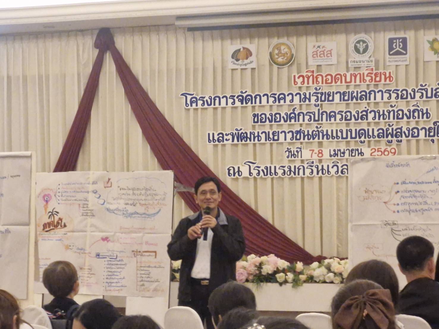 สงขลา | 7–8 เมษายน 2569 – เวทีถอดบทเรียน “การดำเนินงานภายใต้โครงการจัดการความรู้ขยายผลการรองรับสังคมสูงวัยขององค์กรปกครองส่วนท้องถิ่น (อปท.) และการพัฒนาเยาวชนต้นแบบดูแลผู้สูงอายุ” ณ โรงแรมกรีนเวิลด์ พาเลซ โฮเทล จ.สงขลา ได้สะท้อนภาพการ “ยกระดับทั้งระบบ” จากพื้นที่สู่เชิงนโยบาย โดยมีหน่วยงานภาครัฐ ท้องถิ่น และภาคีเครือข่ายร่วมแลกเปลี่ยนบทเรียนและกำหนดทิศทางอนาคต