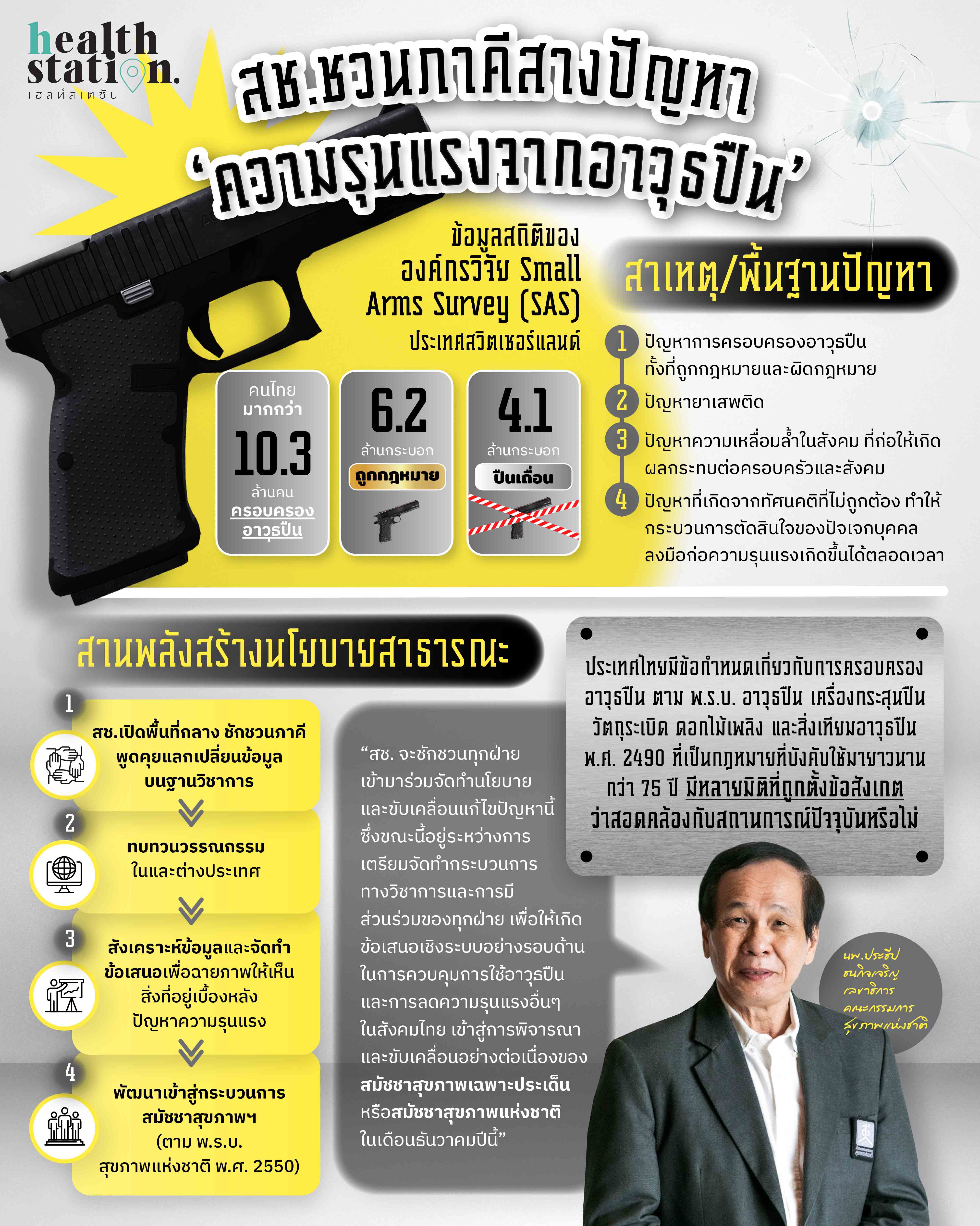 เหตุการณ์คนร้ายใช้อาวุธปืนก่อเหตุในศูนย์เด็กเล็ก จ.หนองบัวลำภู เมื่อวันที่ 6 ต.ค. 2565 จนมีผู้เสียชีวิตรวมกว่า 38 ราย ตลอดจนหลายเหตุการณ์ในอดีต ทำให้สังคมตั้งคำถามว่า จะหยุดความรุนแรงและเสียหายที่เกิดขึ้นในสังคม โดยเฉพาะจากอาวุธปืนได้อย่างไร