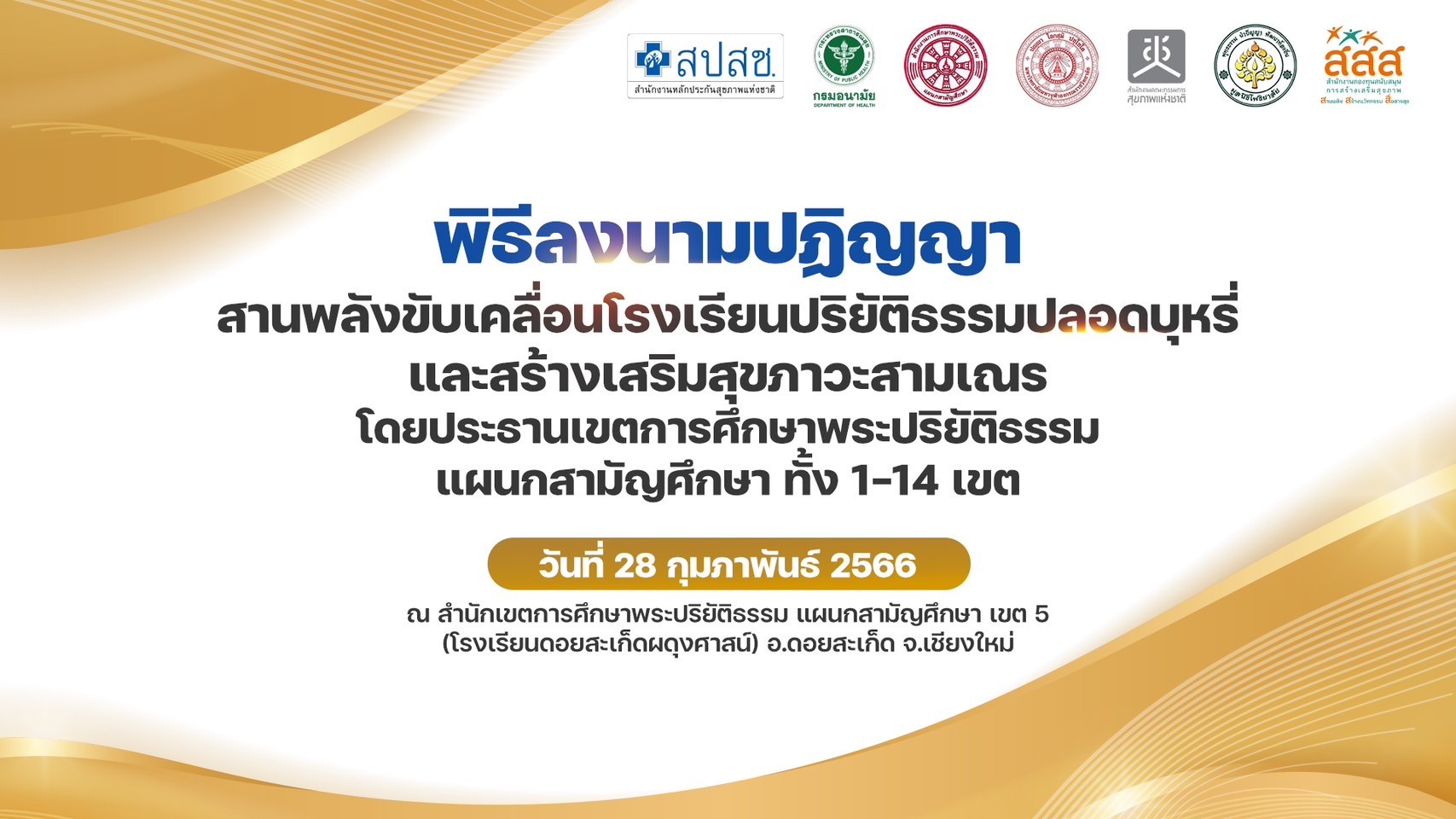 ประธานเขตการศึกษาพระปริยัติธรรม แผนกสามัญศึกษา เขต 1-14 พร้อมด้วยหน่วยงานภาคีองค์กรความร่วมมือด้านสุขภาพพระสงฆ์ ร่วมกันทำพิธีลงนามปฏิญญา สานพลังขับเคลื่อนโรงเรียนพระปริยัติธรรมปลอดบุหรี่และสร้างเสริมสุขภาวะสามเณร เมื่อวันที่ 28 ก.พ 2566 ณ สำนักเขตการศึกษาพระปริยัติธรรมแผนกสามัญศึกษาเขต 5 อ.ดอยสะเก็ด จ.เชียงใหม่