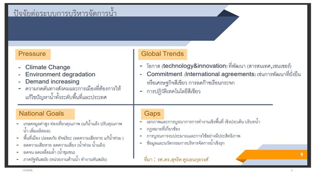 ที่ผ่านมาการแก้ไขปัญหาเชิงโครงสร้างยังสะเปะสะปะ ระบบการบริหารราชการแผ่นดินยังเป็นไปแบบต่างคนต่างทำงาน แต่ละกระทรวงถือกฎหมายคนละฉบับขาดการทำงานเชิงบูรณาการ ขาดการมีส่วนร่วมของภาคประชาสังคม ทั้งที่การบริหารจัดการน้ำมีหน่วยงานที่เกี่ยวข้องถึง 40 หน่วยงาน จาก 13 กระทรวงแต่ที่ผ่านมาการทำงานกระจัดกระจายไม่มีเจ้าภาพหลักจนนำสู่ความขัดแย้ง เช่นกรณีเขื่อนปากมู จากปัญหาดังกล่าวสำนักงานคณะกรรมการสุขภาพแห่งชาติจึงได้ผลักดันเป็นแนวทางสู่เป้าหมายเพื่อให้เกิดนโยบายสาธารณะ