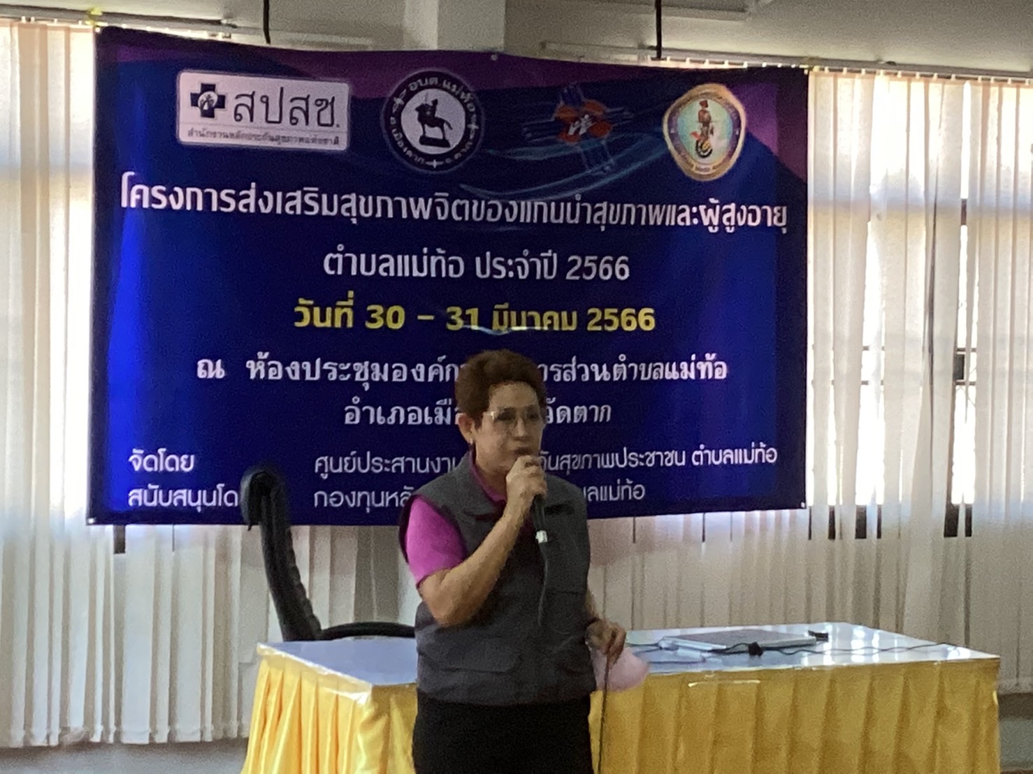 สมาคมสื่อมวลชนจังหวัดตาก ร่วมกับองค์การบริหารส่วนตำบลแม่ท้อ อ.เมือง จ.ตากได้จัดโครงการส่งเสริมสุขภาพจิตของแกนนำสุขภาพและผู้สูงอายุ ตำบลแม่ท้อ ประจำปี 2566 ณ ห้องประชุม องค์การบริหารส่วนตำบลแม่ท้อ โดยมี นายบำรุง ปั้นรูป นายกองค์การบริหารส่วนตำบลแม่ท้อ เป็นประธานในการเปิดโครงการ กลุ่มเป้าหมายประกอบด้วยแกนนำสุขภาพตำบล (อสม)และผู้สูงอายุ ตำบลแม่ท้อ จำนวน 80 คน เข้าร่วมโครงการ สำหรับโครงการนี้ ได้รับเงินสนับสนุนจากกองทุนสุขภาพตำบลแม่ท้อ